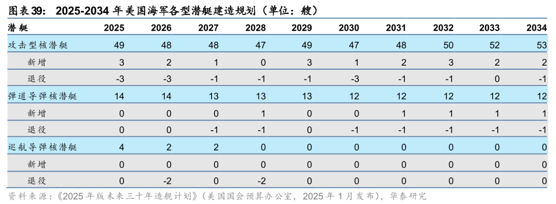 潜艇是水下攻防体系的核心组成部分。美国海军计划在2025-2034年维持“每年建造2艘攻击型核潜艇和1艘弹道导弹核潜艇”的高强度节奏。这旨在同时满足常规水下战力和海基核威慑力量的更新需求,未来十年,弗吉尼亚级仍是攻击型核潜艇部队的绝对主力和新装备的核心,最新的Block VI型将持续提升静音性能、作战系统和导弹搭载能力。