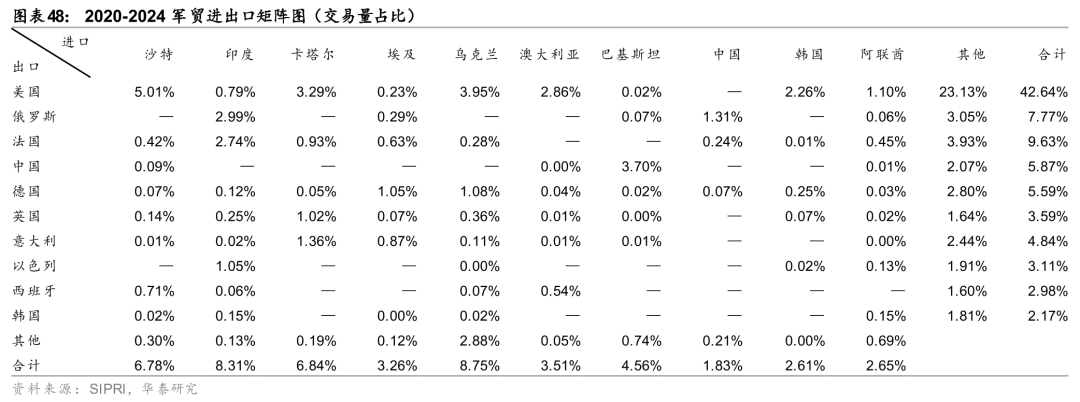 军贸武器供给集中度高,美国占全球军贸市场43%的份额。先进军用武器制造对于国家的科技、工业水平有较高的要求,军贸出口国主要集中在美国、俄罗斯、法国、中国、德国等。根据SIPRI数据,2020-2024年,前十大军贸出口国为美国、法国、俄罗斯、中国、德国、英国、意大利、以色列、西班牙和韩国,合计出口武器占军贸市场的88.17%。美国是第一大军贸出口国,近几年军贸市场份额进一步提升,2020-2024年美国军贸市场份额42.64%,较2015-2019年的市场份额提高7.61pcts。解放军报报道,2024财年美国政府对外军售项目金额可能达到1000亿美元,大幅超过2023财年的662亿美元。