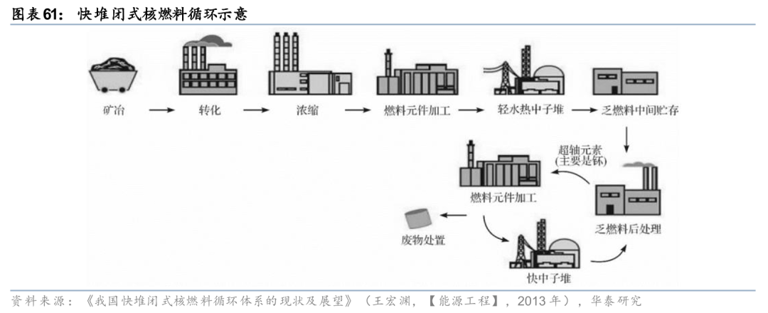 2)钠冷快堆是我国核能发展三步走战略重要环节,与压水堆匹配发展构成闭式核燃料循环体系。压水堆使用的核燃料铀-235仅占天然铀的0.7%,只够人类使用百年,而快堆可以利用无法与热种子反应的铀-238,将铀资源利用率由压水堆的1%左右提高到60%-70%。此外,快堆可以将乏燃料中的长寿命次锕系元素嬗变掉,降低核废料长期毒性风险。2017年12月,中国首个快堆示范工程土建在福建省霞浦县开工;2025年7月,中核集团宣布我国首台第四代百万千瓦商用快堆CFR1000完成初步设计,揭开了中国快堆商用化新篇章。
