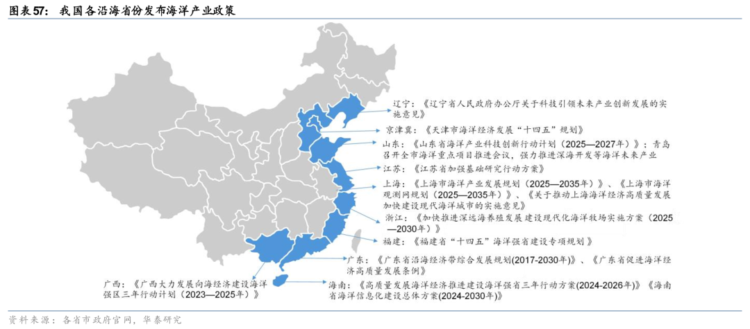 山东、江苏、浙江、福建、广东、海南等沿海省份海洋政策均提及深海,上海、青岛等城市在2025年两会后已率先出台专项规划,加速深海科技产业化落地。目前,地方层面的政策工具包逐步成型,未来有望进一步细化技术攻关、产业扶持与平台建设等配套措施,推动形成“中央战略牵引-地方场景落地-企业创新突破”的协同生态。