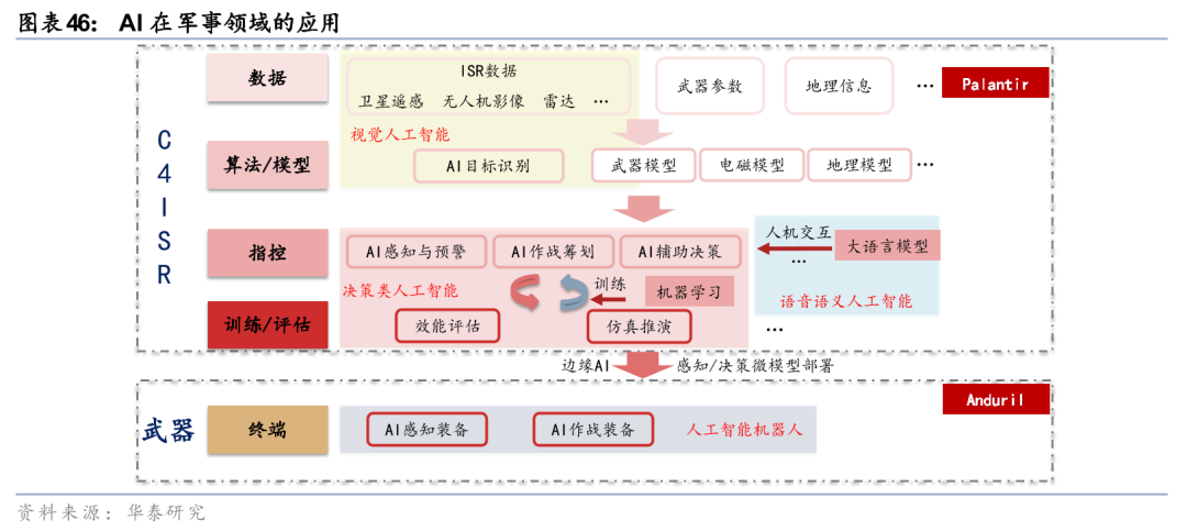 军用AI成为作战效能倍增器。近几年,人工智能技术被广泛应用于军事领域,彻底变革了部队的作战方式,大大提高了部队的作战效率。例如,Palantir承担的美军Maven项目帮助部队大幅缩短目标定位时间,加快目标识别和打击速度。在近期的一次演习中,从情报感知到目标打击的时间线从数小时缩短至数分钟。美陆军计划借助其实现“一小时内完成千次战场目标决策”的新愿景。Palantir承担的美国陆军Vantage项目,通过集成数百个甚至数千个系统数据,可以可视化分析陆军的当前状态以及预测未来状态。通过提供陆军设施、部队和士兵以及物资位置、战备状态和数量的综合信息,Vantage系统使规划人员和决策者能够快速做出可靠的、数据驱动的决策。