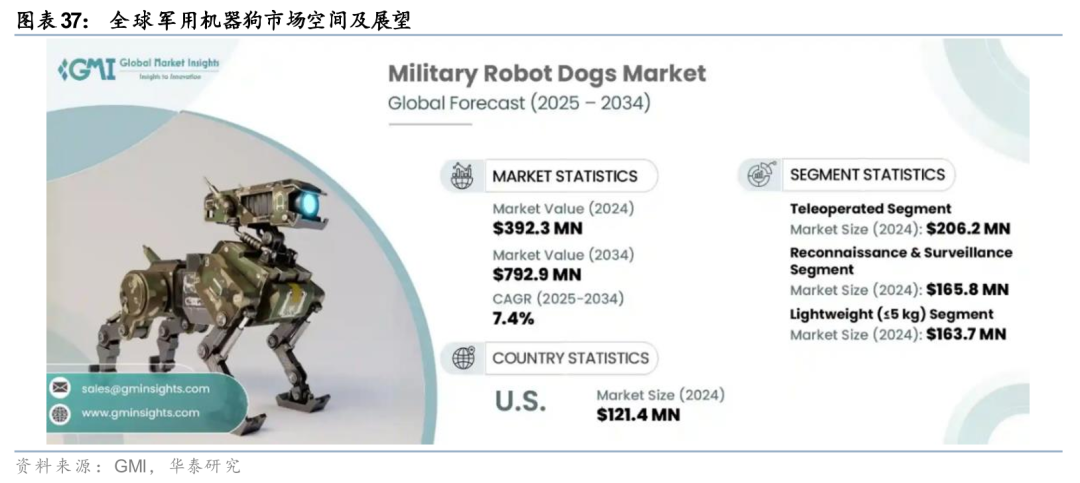 GMI预测2034年全球四足机器人市场达7.93亿美元,CAGR约为7.4%。随着全球国防开支的持续增长和无人作战渗透率的持续提升,全球四足机器人销量有望保持较快增长。据GMI测算,2024年全球军用四足机器人市场空间3.923亿美元,销量86,000台,按功能可分为侦察与监视、战斗支援、搜索与救援、爆炸物处理等,预计2034年全球四足机器人市场空间将达到7.929亿美元,CAGR约为7.4%。