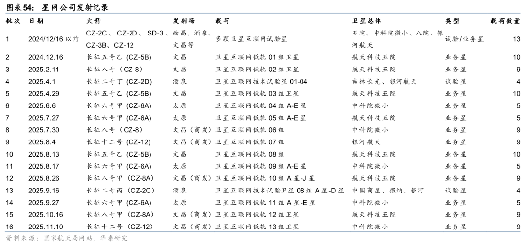 我国卫星互联网建设已进入批量组网阶段。2024年下半年,我国G60星座进入密集组网阶段,分别于2024年8月6日和2024年10月15日在太原卫星发射中心以一箭18星的方式将36颗组网卫星送入轨道,拉开了批量组网的序幕;星网公司则于2024年2月29日、8月1日和10月10日,分别将卫星互联网高轨卫星01/02/03星送入既定轨道,截至2025年11月13日,星网公司共将16组卫星(包含3组实验星)发射入轨,其中2025年共发射14次,2025年7月27日到8月25日,星网连续完成了6次卫星互联网低轨卫星组网发射任务,共发射47颗卫星,动用了4种不同型号的火箭,标志着卫星互联网建设提速。随着我国卫星产业链持续完善,卫星制造和发射能力将显著提升,卫星星座的规划也将持续转化为实际的卫星制造/发射需求和订单,为产业链相关公司带来相应的现金流和业绩。