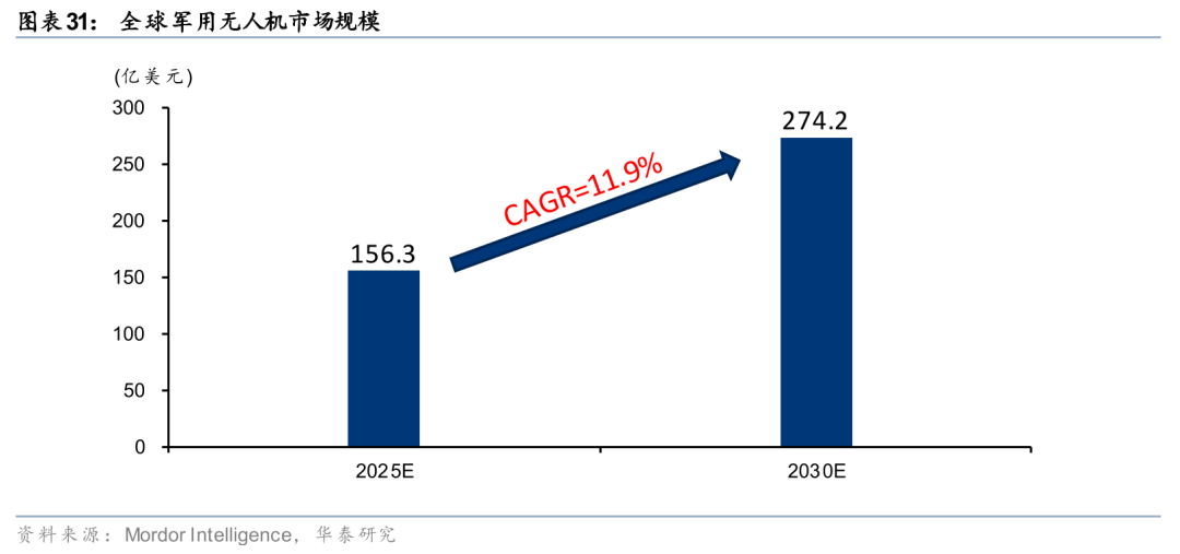 多国成立无人系统部队,全球军用无人机市场快速发展。随着无人机等无人系统在战场上的广泛运用,全球多国加紧组建专业化的无人系统部队,美国、俄罗斯、伊朗等是其中的代表。全球军用无人机市场规模也呈现出快速增长的趋势,根据Mordor Intelligence预测,2025年军用无人机市场规模约为156.3亿美元,预计到2030年将达到274.2亿美元,复合增速11.90%,增长的主要驱动因素为无人机在各国国防体系中的渗透率提升和实际作战需求。