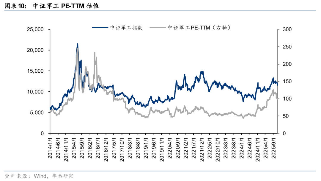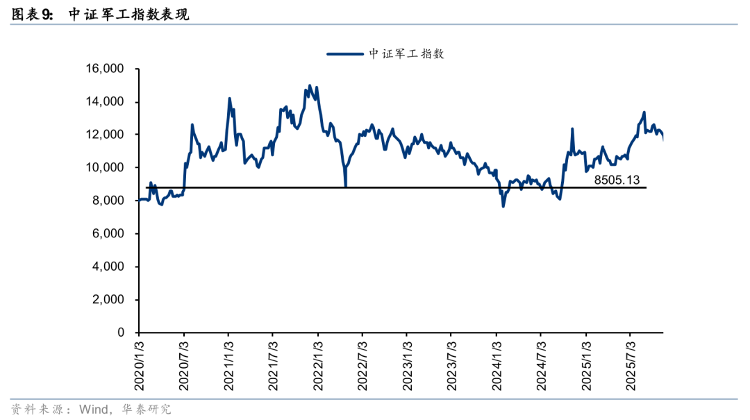 2025年,“十四五”规划进入收官之年,同时也是打好实现建军一百年奋斗目标攻坚战的关键一年。在军工行业客户采购节奏恢复的预期下,中证军工指数震荡上行,3月11日,中证军工指数11259.47,较1月6日中证军工指数9763.68上涨15%。6月下旬至8月底,A股大盘稳健上涨,军工板块在九三阅兵先进武器装备亮相的预期下也取得较大涨幅。8月29日,中证军工指数13378.55,较6月23日中证军工指数10743.16上涨25%。