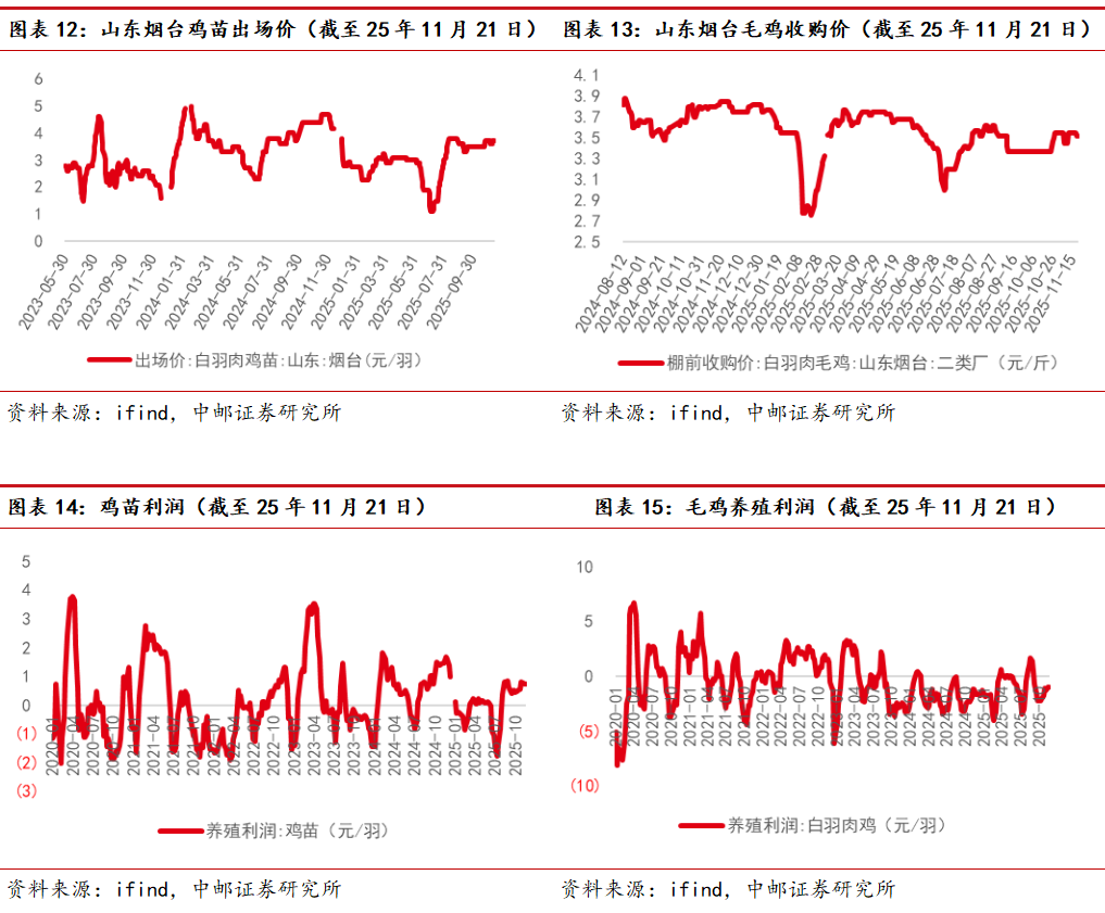 截至11月21日,烟台白羽肉鸡鸡苗价格为3.7元/羽,继续持平,平均单羽盈利约0.8元;同时肉毛鸡价格有所松动,下降0.03元/斤至3.52元/斤。供需博弈焦灼:年前补栏,支撑苗价;但终端消费疲软,毛鸡价格疲软,苗价上行受限。