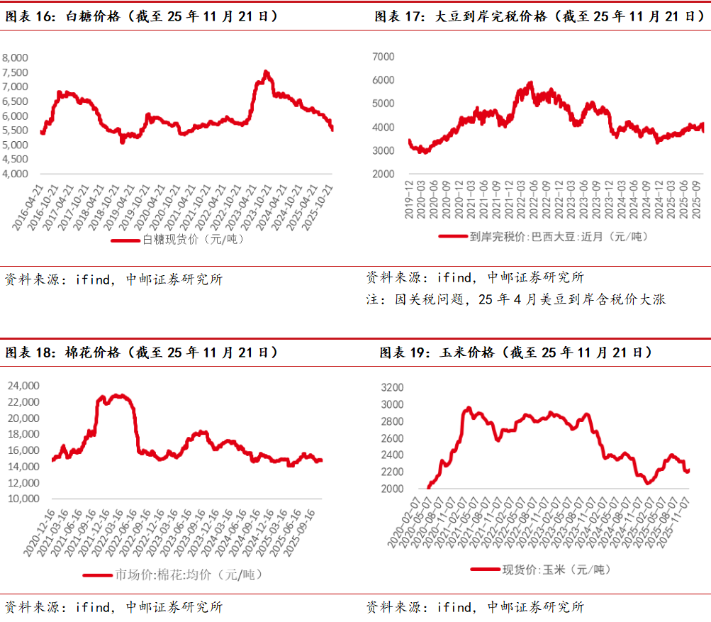 棉花:连续小降。截至25年11月21日,棉花价格为14789元/吨,较上周跌0.26%。