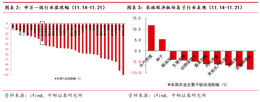 从农业子板块看,除水产养殖、种子两个板块上涨外,其余细分行业均下跌。