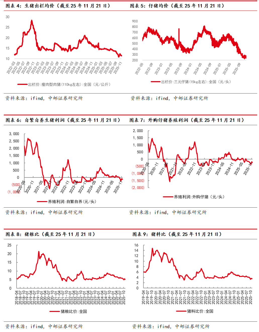 供给压力仍大,产能去化还将持续。24年5月以来生猪产能增加,其对应着25年四季度及26年一季度供给继续增加,预计猪价压力仍大。但生猪行业“反内卷”持续加码,农业部、发改委、行业协会等多方多次召开会议,围绕“控产能、降体重、限二育”精准发力。当前距离产能调减目标设定的时间期限越来越近,政策执行力度、养殖企业压力等都将有所加大;同时行业已经进入全面亏损,且供给压力短期难以缓解,产能被动去化将有所增加;另外秋冬季节疾病扰动加剧。政策、行业周期性及季节性影响等多重因素影响下,预计近期生猪产能去化仍是行业主调,明年下半年猪价有望迎来新一轮上行趋势。