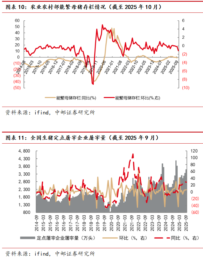 10月产能去化超预期。农业部公布10月能繁存栏为3990万头,环比9月下降45万头,降幅为1.1%(前值-0.2%)。能繁母猪时隔17个月重回4000万头以下,母猪调减100万头的目标,10月底已经达成一半。26年下半年猪价上行的确定性再度增强。