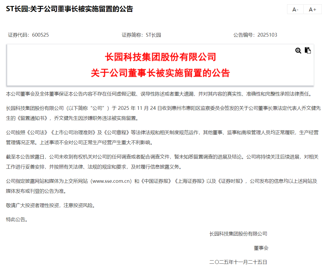 ST长园(维权)董事长因涉嫌职务违法被监察部门留置,这一戏剧性转折瞬间引发资本市场关注。 11月25日,长园科技集团股份有限公司(以下简称ST长园)发布公告称,公司于11月24日收到惠州市惠阳区监察委员会签发的关于公司董事长兼法定代表人乔文健的《留置通知书》,其因涉嫌职务违法被实施留置。公告还称,截至目前,公司未收到有权机关对公司的任何调查或者配合调查文件,暂未知悉留置调查的进展及结论。
