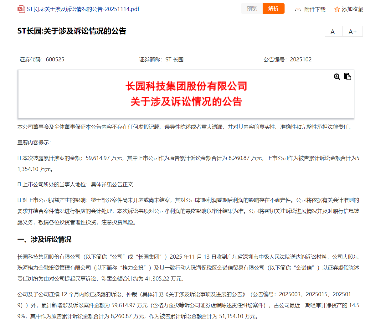 11月14日,ST长园还发了一条涉诉公告,该公司第一大股东珠海格力金融投资管理有限公司及其一致行动人珠海保税区金诺信贸易有限公司以证券虚假陈述责任纠纷为由对公司提起民事诉讼,涉案金额合计4.13亿元。