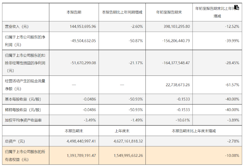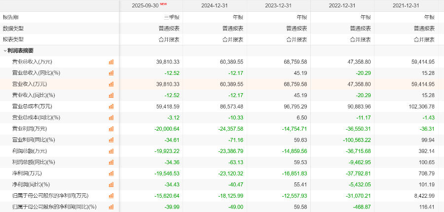 2025年前三季度业绩继续下滑,报告期内,实现营业收入3.98亿元,同比下降12.52%;同期归属于母公司股东的净利润为-1.56亿元,同比下降39.99%。