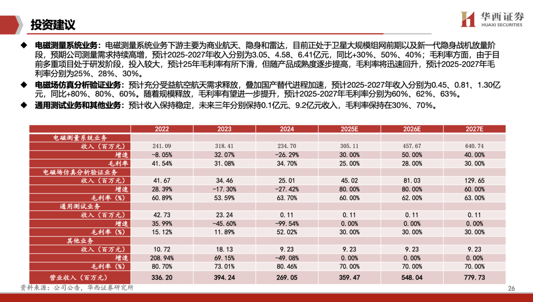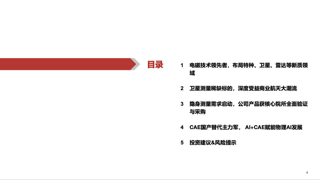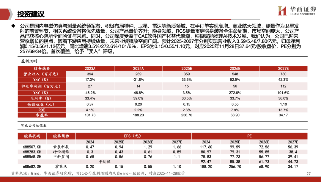 公司是国内电磁仿真与测量系统领军者,积极布局特种、卫星、雷达等新质领域,在手订单实现高增。商业航天领域,测量作为卫星发射的前置环节,相关系统设备将优先放量,公司产品量价齐升;隐身领域,RCS测量贯穿隐身装备全生命周期,市场空间庞大,公司产品已获核心院所全面验证与采购。同时,公司深度受益于CAE软件国产化替代浪潮,积极赋能物理AI技术发展。我们认为,公司已迎来营收增长的拐点,随着下游应用持续放量,未来业绩释放空间广阔。预计2025-2027年分别实现营业收入3.59/5.48/7.80亿元,归母净利润0.15/0.56/1.12亿元,同比增速3.5%/272.6%/101/6%,EPS为0.15/0.55/1.10元,对应2025年11月28日37.64元/股收盘价,PE分别为257/69/34倍。首次覆盖,给予“买入”评级。