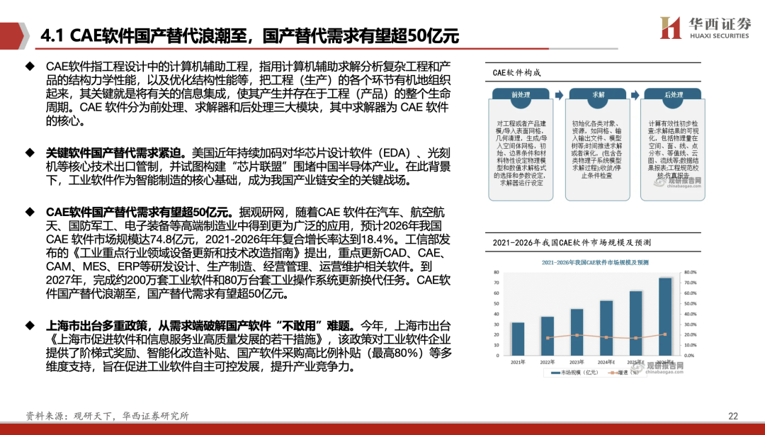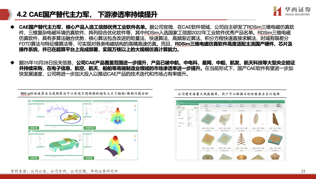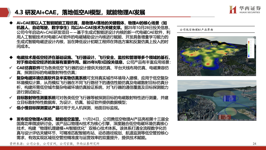 关键软件国产替代需求紧迫。美国近年持续加码对华芯片设计软件(EDA)、光刻机等核心技术出口管制,并试图构建“芯片联盟”围堵中国半导体产业。在此背景下,工业软件作为智能制造的核心基础,成为我国产业链安全的关键战场。据观研网,CAE软件国产替代需求有望超50亿元。公司作为CAE国产替代主力军,核心产品入选工信部优秀工业软件名单。公司RDSim三维电磁仿真软件高度适配主流国产硬件、芯片及操作系统,并已在超算平台上完成部署,实现万核以上的大规模仿真计算能力。同时,公司积极研发AI+CAE,赋能物理AI发展。11月24日,公司低空物理AI产品亮相,该体系打通全流程数字化仿真与设计评估关键环节,可精准匹配智能布站、动态路径规划、航道监测等低空管控核心需求,有效实现区域低空管控精准度与运营效率的双重提升,提供技术赋能。