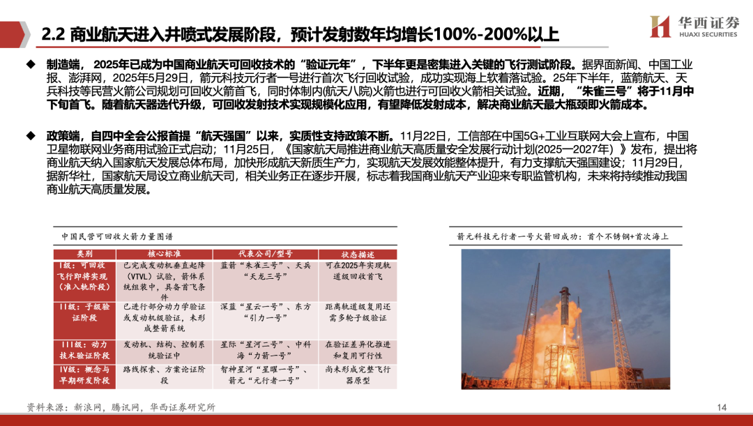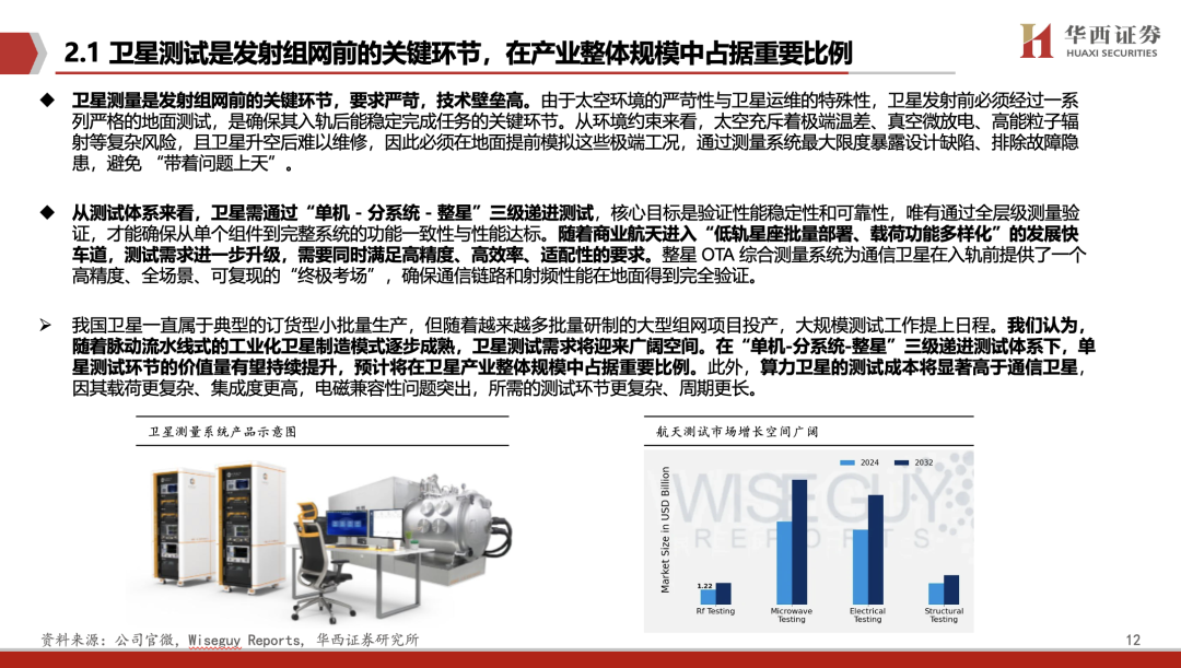 卫星测量是发射组网前的关键环节,要求严苛,技术壁垒高。商业航天是新质生产力的典型代表,我们判断在十五五期间持续有催化剂。可回收火箭试验步伐加快,我们预计卫星发射数量从明年开始每年都是100-200%以上的高增长。随着脉动流水线式的工业化卫星制造模式逐步成熟,卫星测试需求将迎来广阔空间。在“单机-分系统-整星”三级递进测试体系下,单星测试环节的价值量有望持续提升,预计将在卫星产业整体规模中占据重要比例。而算力卫星的测试成本将显著高于通信卫星,因其载荷更复杂、集成度更高,电磁兼容性问题突出,所需的测试环节更复杂、周期更长。同时,无论是科研阶段还是批产阶段,卫星载荷的电磁测试都是重中之重。我们认为,卫星测试设备公司能够较早地兑现业绩,具有较大的弹性。
