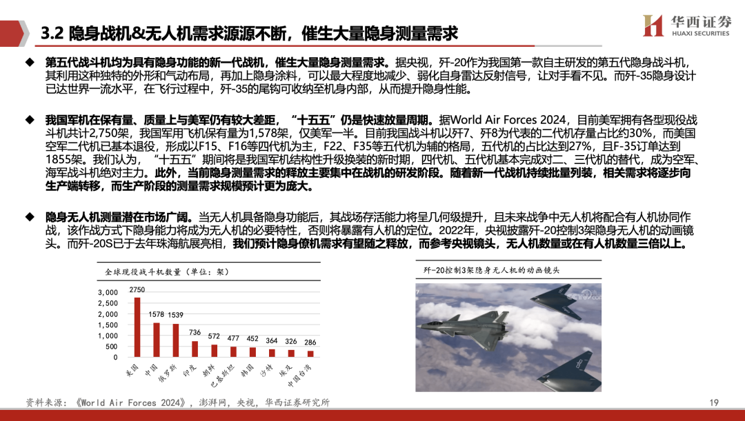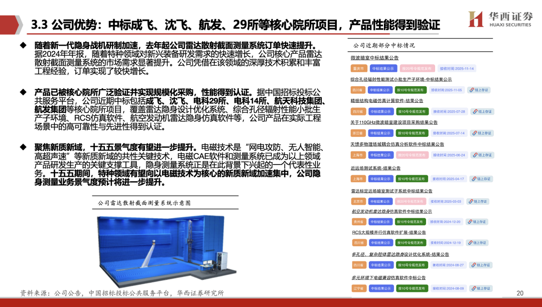 雷达散射截面积测量是设计、制造、维护隐身飞机的必要手段,贯穿全生命周期。第五代战斗机均为具有隐身功能的新一代战机,催生大量隐身测量需求。此外,当前隐身测量需求的释放主要集中在战机的研发阶段。随着新一代战机持续批量列装,相关需求将逐步向生产端转移,而生产阶段的测量需求规模预计更为庞大。同时,隐身无人机测量潜在市场广阔。据中国招标投标公共服务平台,公司近期中标包括成飞、沈飞、电科29所、电科14所、航天科技集团、航发集团等核心院所项目,覆盖雷达隐身设计优化系统、综合孔径辐射性能小批生产子环境、RCS仿真软件、航空发动机雷达隐身仿真软件等,公司产品在实际工程场景中的高可靠性与先进性得到认证。