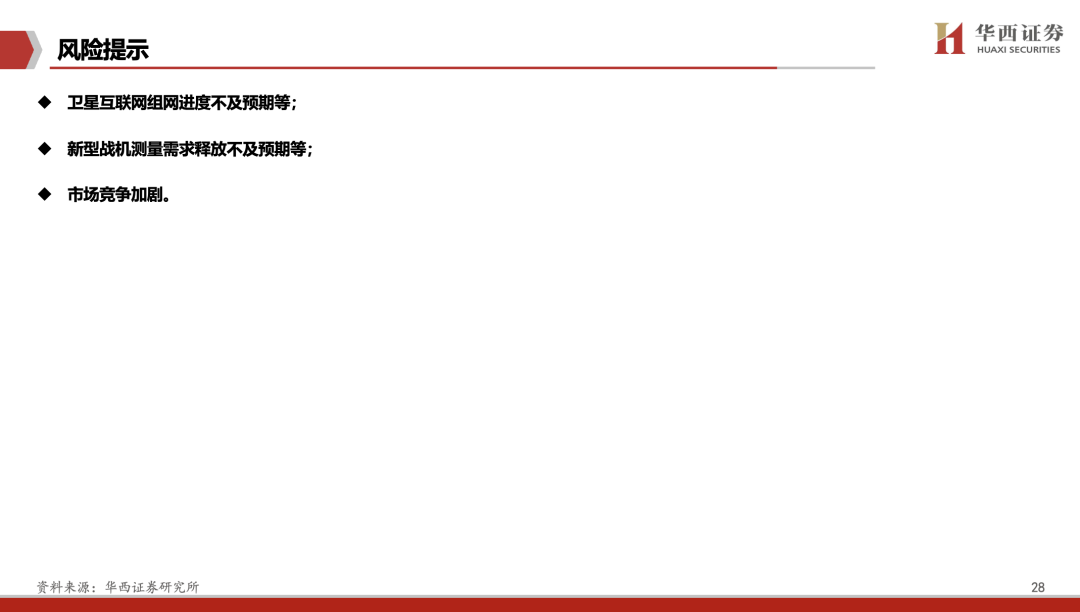 卫星互联网组网进度不及预期等;新型战机测量需求释放不及预期等;市场竞争加剧。