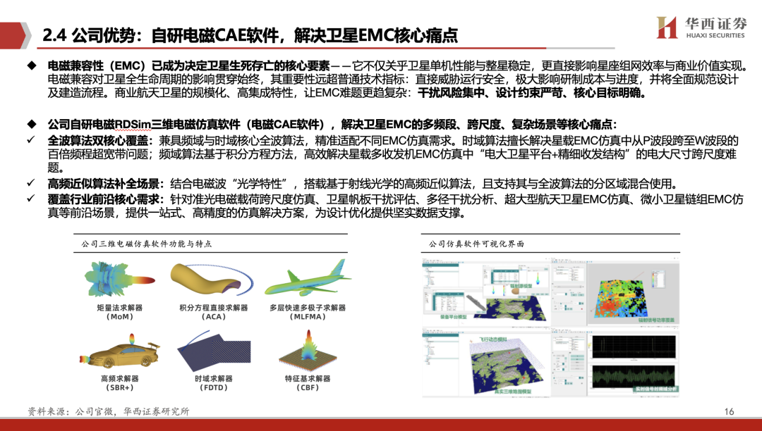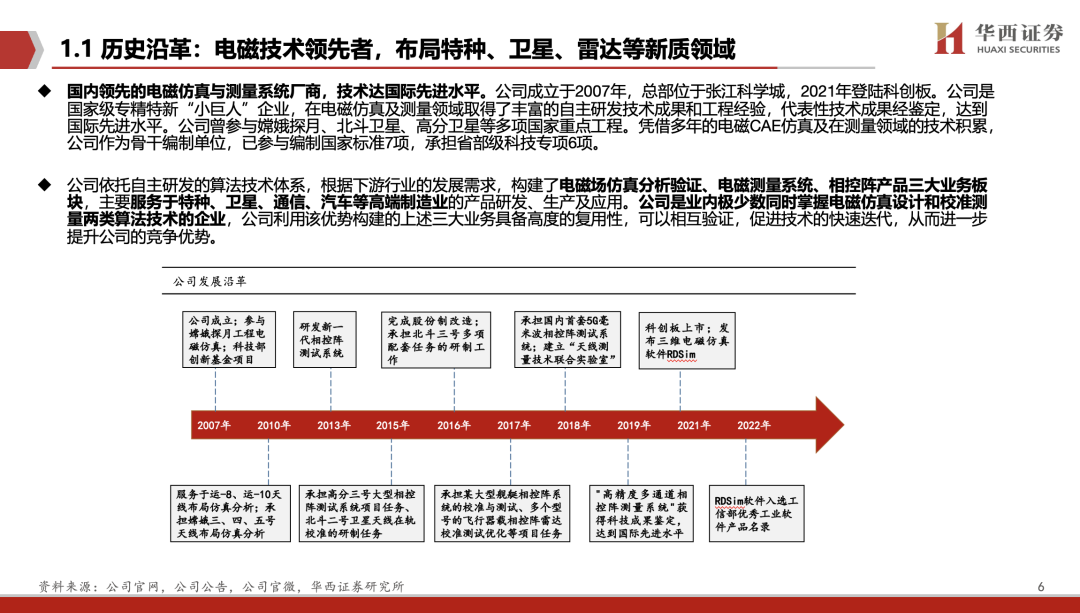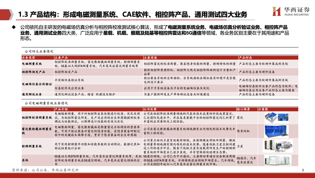 国内领先的电磁仿真与测量系统厂商,技术达国际先进水平。公司依托自主研发的算法技术体系,根据下游行业的发展需求,构建了电磁场仿真分析验证、电磁测量系统、相控阵产品三大业务板块,主要服务于特种、卫星、通信、汽车等高端制造业的产品研发、生产及应用。公司是业内极少数同时掌握电磁仿真设计和校准测量两类算法技术的企业。