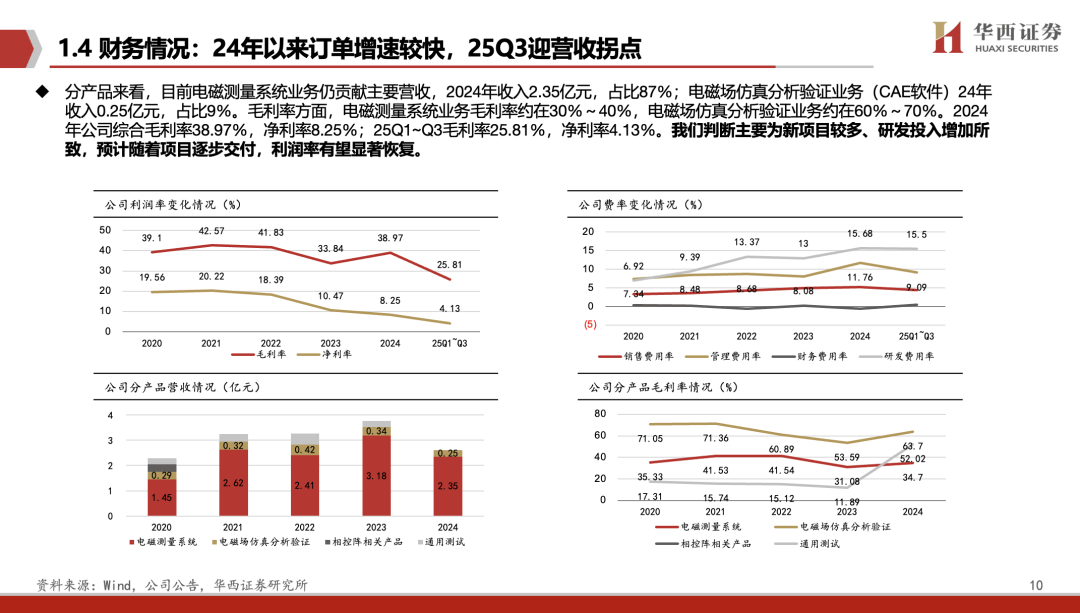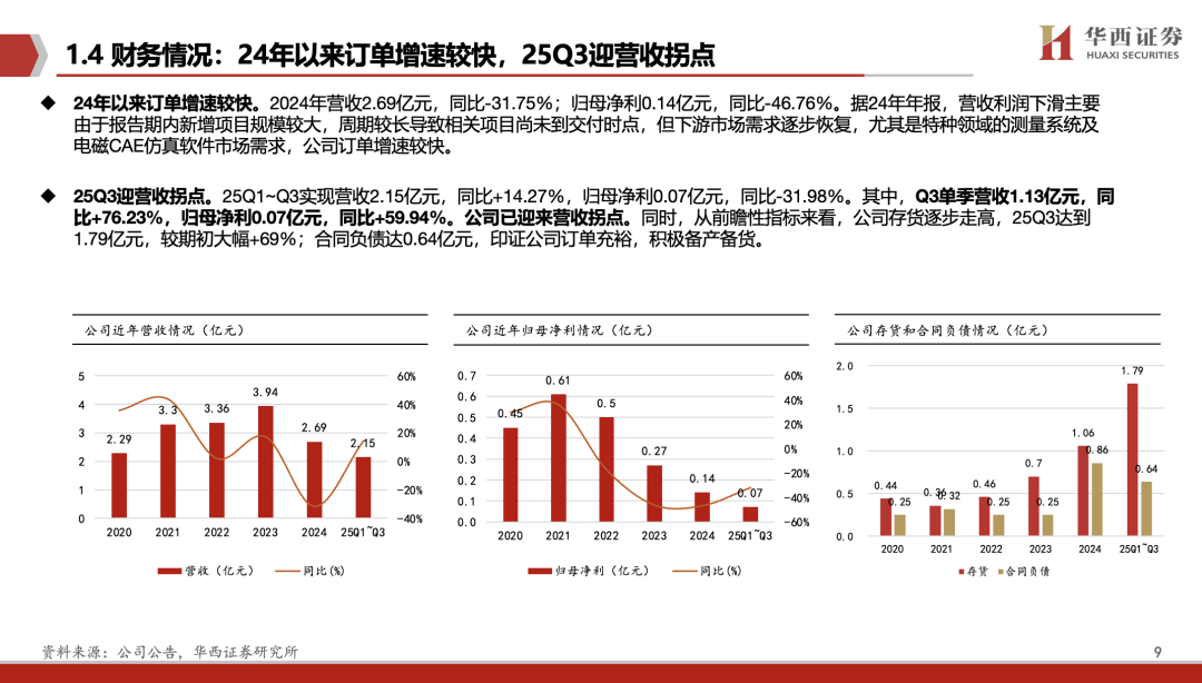 24年以来订单增速较快,25Q3迎营收拐点。2024年营收2.69亿元,同比-31.75%;归母净利0.14亿元,同比-46.76%。但下游市场需求逐步恢复,尤其是特种领域的测量系统及电磁CAE仿真软件市场需求,公司订单增速较快。25Q1~Q3实现营收2.15亿元,同比+14.27%,归母净利0.07亿元,同比-31.98%。其中,Q3单季营收1.13亿元,同比+76.23%,归母净利0.07亿元,同比+59.94%。公司已迎来营收拐点。同时,存货及合同负债高增,印证公司订单充裕,积极备产备货。