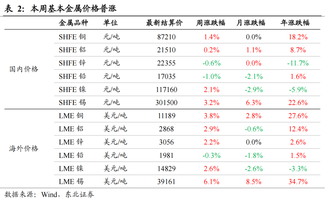国外方面,LME铜上涨3.82%至11189美元/吨,LME铝上涨2.94%至2868美元/吨,LME锌上涨2.22%至3056美元/吨,LME铅下跌0.25%至1981美元/吨,LME镍上涨2.59%至14829美元/吨,LME锡上涨6.14%至39161美元/吨。
