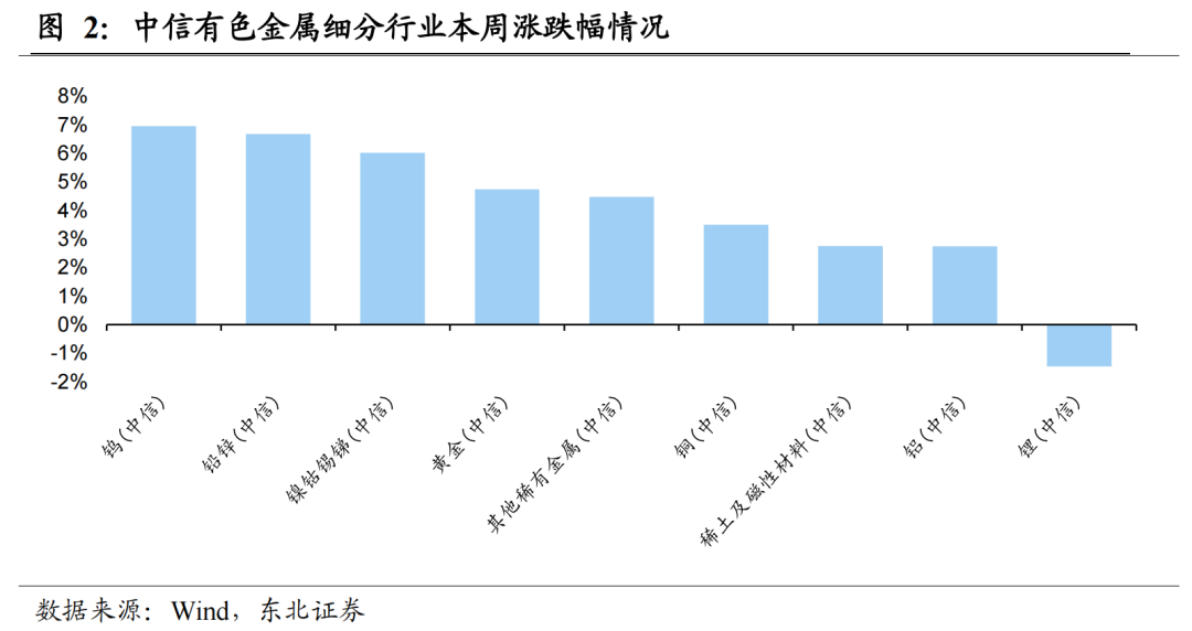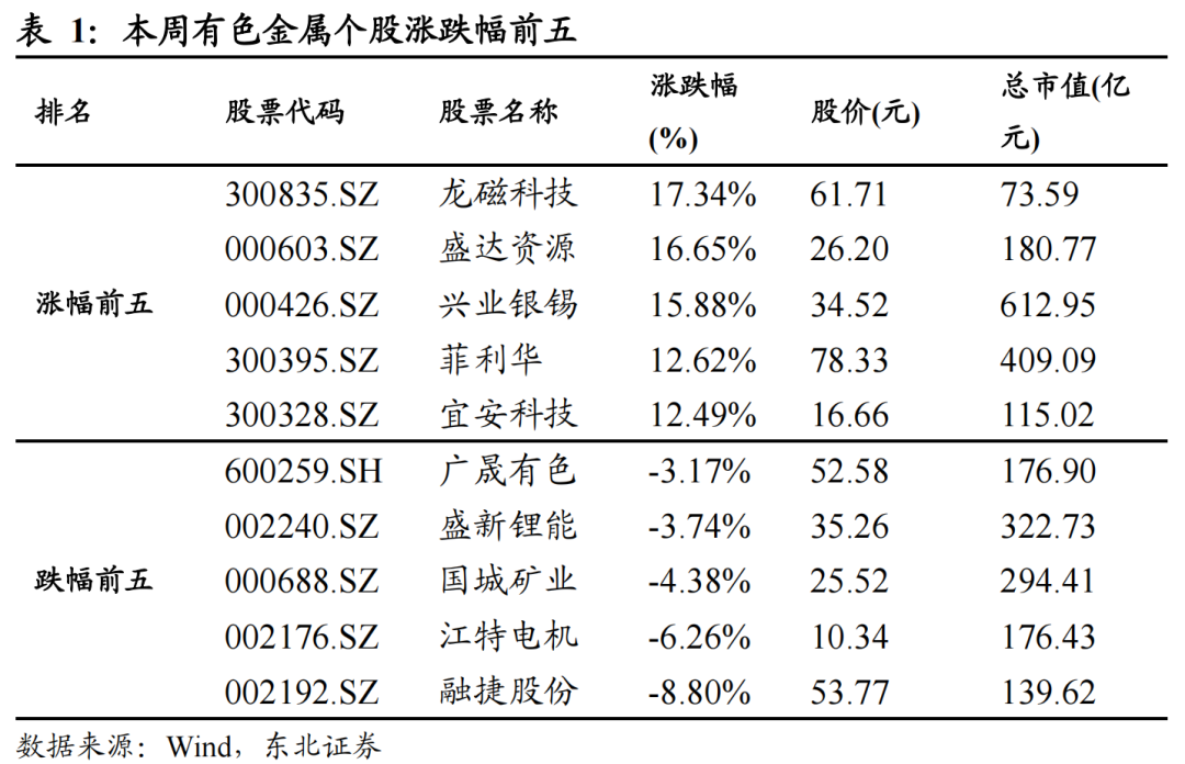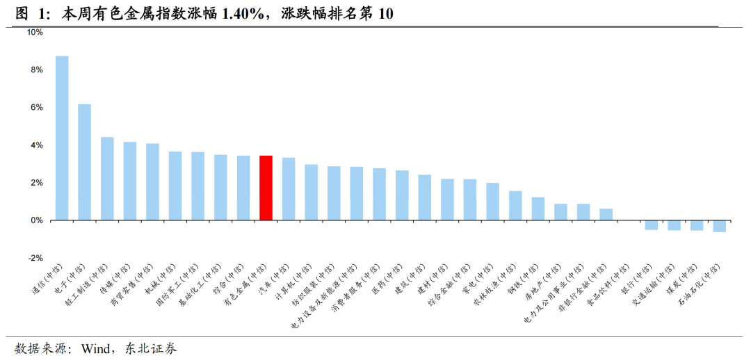 本周上证指数涨幅1.40%,有色金属指数涨幅3.42%,跑赢大盘2.02%,在30个子行业中排名10。有色金属细分板块中表现前三为:钨涨幅6.96%,铅锌涨幅6.69%,镍钴锡锑涨幅6.02%。个股涨幅前三为龙磁科技(17.34%)、盛达资源(16.65%)、兴业银锡(15.88%)。个股跌幅前三为国城矿业(维权)(-4.38%)、江特电机(-6.26%)、融捷股份(-8.80%)。