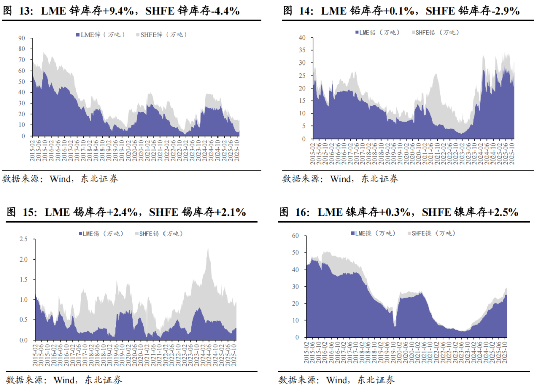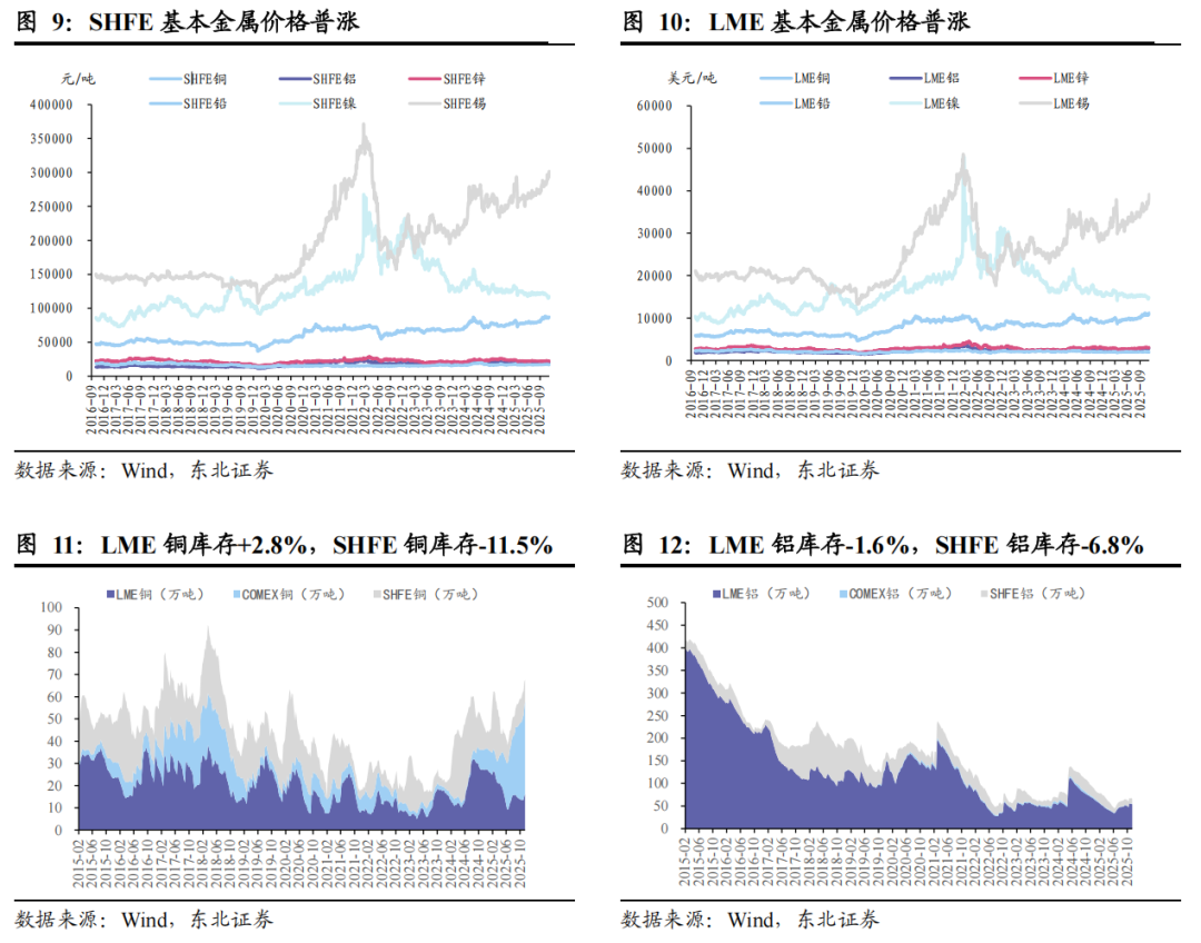 铜:铜价突破前高,利多氛围仍将延续。截至周五夜盘,LME铜收于11175.5美元/吨,盘中触及11210.5美元/吨,突破25/10/29创下的11200美元/吨前高。1)本次铜价破前高主要得益于降息预期升温和基本面叙事强化:①降息预期重新走强:随着多位联储官员密集发声,12月降息预期重新走强,FedWatch降息概率从最低~30%飙升至86%。②Codelco 26年长单升水创纪录:Codelco向中国买家提出2026年电解铜长协溢价350美元,较2025年89美元/吨上涨近3倍,或主因作为COMEX注册品牌,报价考虑了COMEX的高溢价。③铜冶炼减产预期升温:CSPT成员企业达成共识,26年降低矿铜产能负荷10%以上。2)利多氛围仍将延续,积极布局铜矿股:①宏观大方向未变:仍处全球财政扩张+流动性宽松周期,尤其26Q2联储将换届;②矿端高扰动低增量格局明确;③美对铜加关税可能性导致美铜溢价仍在,库存虹吸导致非美地区低库存格局仍将延续。未来铜矿股EPS预期和PE均有进一步上修空间,股价表现已短期滞后于铜价,建议积极布局。相关标的:紫金矿业、洛阳钼业、中国黄金国际、五矿资源、江西铜业、西部矿业。未覆盖标的:铜陵有色、金诚信等。