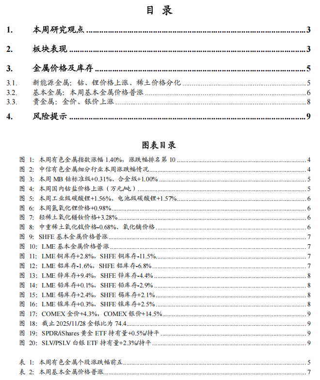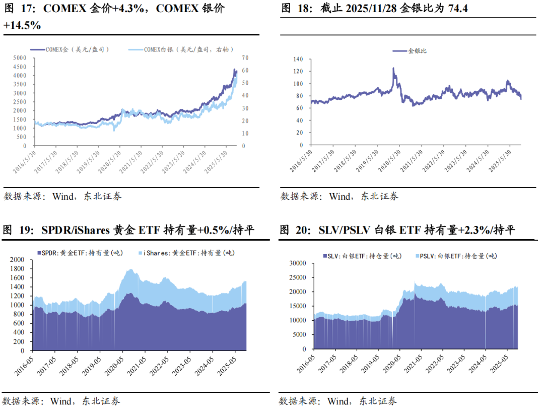 金:本周继续交易12月降息和俄乌地缘问题。1)12月降息预期继续升温:目前FedWatch显示的最新12月降息概率85%,考虑到联储已进入静默期,密集发声期结束,12/10 FOMC前也看不到关键经济数据,就目前联储与市场沟通的结果来看,12月降息概率较大,包括本周沃勒、米兰等官员均明确支持继续降息。随市场重新积极定价降息预期,本周美债利率明显走低,金价也由此上涨,不过12月FOMC会议除了关注是否降息之外,点阵图以及鲍威尔讲话是否鸽派也将对短期金价造成扰动。2)俄乌和谈前景仍存在较大不确定性:在上周,美俄讨论出了“28点方案”,但乌克兰不接受,欧洲认为偏袒俄罗斯,上周末美欧乌在日内瓦会谈,本周给出“19点新方案”,有几个变化,①搁置争议,将割地这一红线问题移出当前谈判;②取消乌军60万兵力上限的明确限制;③将乌克兰加入北约问题留待后续讨论。但俄罗斯又比较难接受19点方案。目前更像是美方进一步细化俄、乌双方的谈判诉求,但领土这种实质问题还是很难谈拢,后续和谈前景仍存在较大不确定性。3)哈塞特可能要出任联储主席,有望强化金价走势:本周外媒报道哈塞特是联储主席的领跑人选(目前的白宫经济委员会主任),哈塞特作为鸽派&政治忠臣的属性,假设其当选联储主席,很容易加强市场对于明年降息幅度的押注,以及增加对联储独立性的担忧,在中期维度上会更利多黄金。相关标的:紫金黄金国际、山东黄金、山金国际、赤峰黄金;未覆盖标的:湖南黄金、中金黄金、西部黄金、招金矿业、恒邦股份、鹏欣资源、灵宝黄金、潼关黄金等。