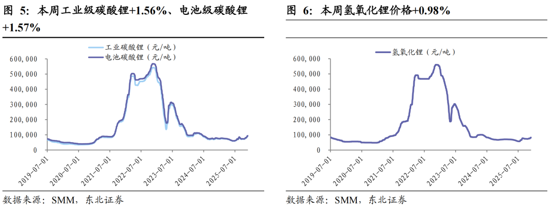 锂:本周,锂精矿价格+5.6%至1089美元/吨。锂盐方面,工业级碳酸锂价格+1.56%至9.13万元/吨,电池级碳酸锂价格+1.57%至9.38万元/吨,氢氧化锂价格+0.98%至8.21万元/吨。