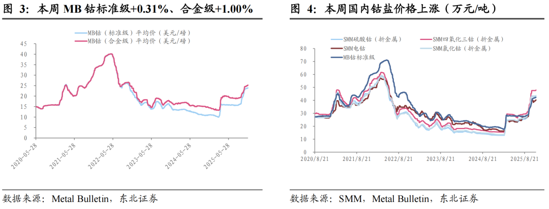 钴:本周,MB钴标准级均价+0.31%至23.90美元/磅,合金级均价+1.00%至25.25美元/磅;国内方面,电钴本周价格+1.64%至40.30 万元/吨。钴盐方面,硫酸钴+0.40%至43.37万元/吨(折金属),四氧化三钴+0.88%至47.99万元/吨(折金属),氯化钴+0.71%至43.70万元/吨(折金属)。