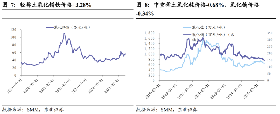 稀土:本周,轻稀土方面,氧化镨钕价格+3.28%至56.65万元/吨;中重稀土方面,氧化铽价格-0.68%至652.50万元/吨,氧化镝价格-0.34%至148.00万元/吨。