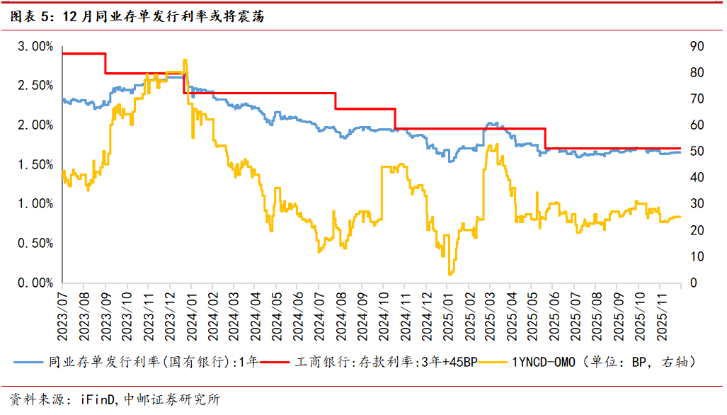 根据历史规律,12月定期存款到期量或为四季度的高峰,不排除季末时点部分银行加快投放以完成全年目标,同时12月零售业务开门红活动启动将推动到期定存向非银迁移或扰动同业存单供给量和价。11月银行负债端压力较10月环比改善,整体国股银行一级发行利率下行至1.6%—1.65%,同时结合历年12月规律来看,剔除2024年同业存款整改影响外,同业存单发行利率整体上行。我们预计12月1年期国股银行同业存单发行利率维持在1.6%左右震荡,向下突破或需要央行超预期投放流动性推动。