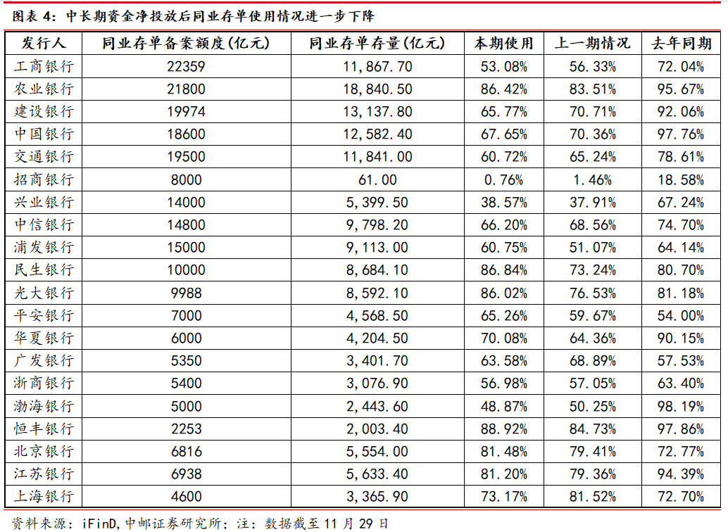 10月至11月,由于货币政策工具维持积极投放,多数全国性银行同业存单使用额度占比相对上期三季度末有所下降,国有行存单额度释放更为明显。考虑国有银行四季度资产投放力度或边际放缓,预计国有银行同业存单净融资增速或边际下行。