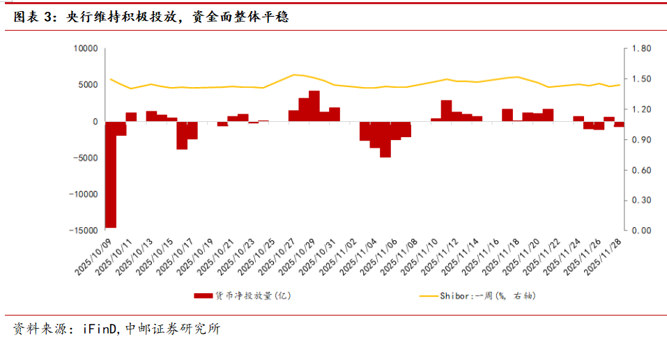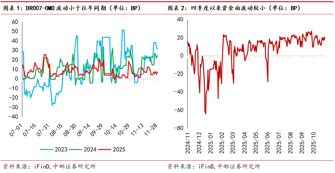 进入四季度以来,银行间资金运行波动幅度显著小于2023及2024年同期水平。从DR007-OMO利率来看,进入10月后,货币政策工具呵护投放叠加政府债券发行量不大,资金面出现季节性转松。月末税期影响之下资金面短暂承压,而后伴随着买断式和MLF积极净投放与央行买债重启,资金整体趋于平稳。11月货币工具投放力度不减,货币政策对于流动性的呵护态势仍明确。至月末临近跨月时点,资金面波动小幅放大。
