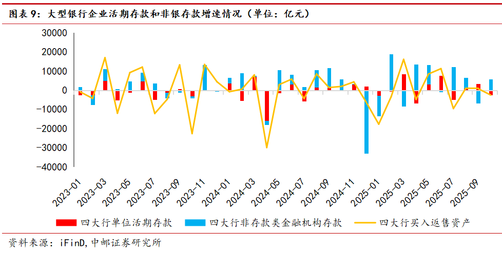 从大型银行和中小银行对公活期存款增速来看,当前其走势与经济高频指数走势阶段性背离,或与2024年9月末推出逆周期宏观政策在10月形成集中工作量产生的高基数有关。进入12月,预计10月和11月新型政策性金融工具产生的实物工作量持续推动经济回暖,银行对公活期存款增速或持续维持在正向区间。但受居民和企业定期存款到期后向非银机构迁移影响,大型银行资金融出意愿或受到一定压制。