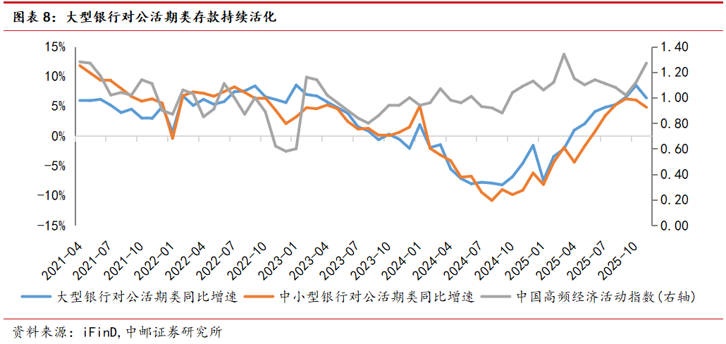 从监测指标来看,年内超储率在近两年同期来看处于中上水平,10月超储率1.18%,与2024年整体一致。9月末测算核心超储率偏低,或意味着银行体系内可稳定动用的长期闲置资金不足,此外财政支出节奏加快、专项债发行与拨付周期缩短,财政资金沉淀时长缩短也是核心超储偏低原因之一;10月大型银行NSFR为107.09%,略高于2024年同期,推测原因为资产端信贷投放低于去年同期,央行通过买断式逆回购和MLF净投放改善了银行负债结构,预计11、12月NSFR读数或季节性上行;从对公活期存款增速来看,与经济高频指数走势阶段性背离。进入12月,预计近两月新型政策性金融工具产生的实物工作量持续推动经济回暖,银行对公活期存款增速或持续维持在正向区间。但居民和企业定期存款到期后向非银机构迁移或影响大行资金融出意愿。