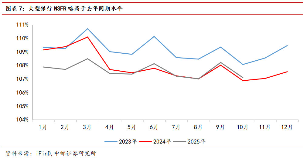 我们测算10月大型银行NSFR为107.09%,略高于2024年同期,推测原因是资产端信贷投放低于去年同期,央行通过买断式逆回购和MLF净投放改善了银行负债结构。11月部分银行提前进入存款开门红,预计11、12月NSFR读数或季节性上行,同时12月随着资负两端压力边际下行,预计读数可能高于去年同期。