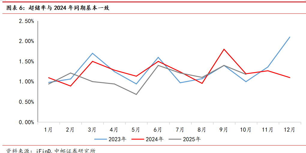 年内超储率表现在近两年同期来看整体处于中上水平。10月测得超储率为1.18%,与2024年整体一致,显著高于2023年水平。2025年以来出现了剔除质押式逆回购的核心超储率偏低的现象,比如9月末按官方超储率计算的核心超储率仅为0.5%,这一指标偏低意味着银行体系内可稳定动用的长期闲置资金不足,银行体系可用稳定资金不足源头或指向存款利率下降至历史低点后明显的存款“搬家”行为,另一方面财政支出节奏加快、专项债发行与拨付周期缩短,财政资金沉淀在银行的期限从平均1-2年缩短至3-6个月,稳定性下降。