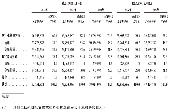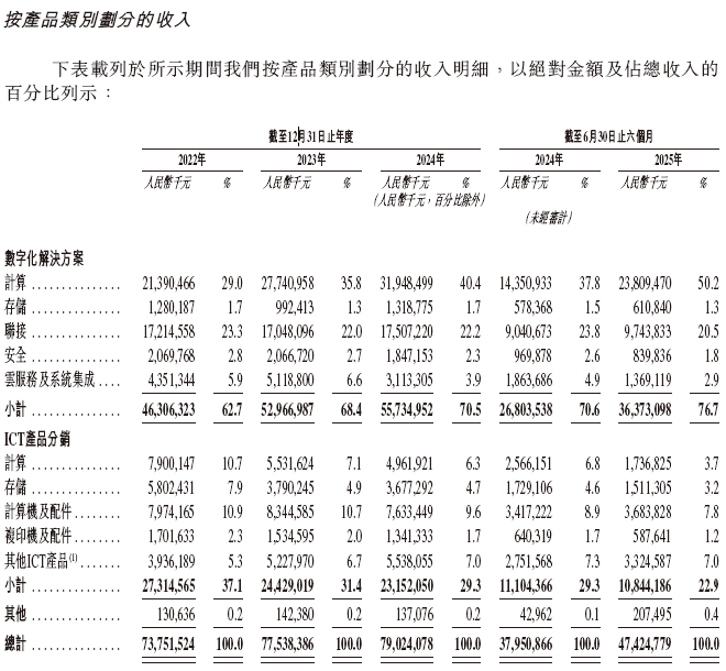 紫光股份的主要业务分部包括(i)数字化解决方案及(ii)ICT产品分销。数字化解决方案包括广泛的产品,旨在为客户的数字化转型及人工智能应用提供支持,包括提供自主研发的计算、存储、联接及安全产品以及云服务及系统集成。ICT产品分销方面,公司分销购自国内外知名品牌的广泛ICT产品,公司按协商价格自供货商购买该等产品,并加价售予客户。