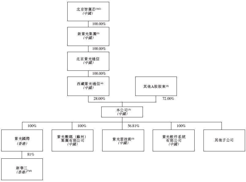 西藏紫光通信由北京紫光通信全资拥有,北京紫光通信由新紫光集团全资拥有,新紫光集团由北京智广芯全资拥有。北京智广芯由12名股东拥有,该等股东均无权于北京智广芯股东大会上行使或控制行使多数表决权,亦无法控制北京智广芯董事会多数成员的组成。