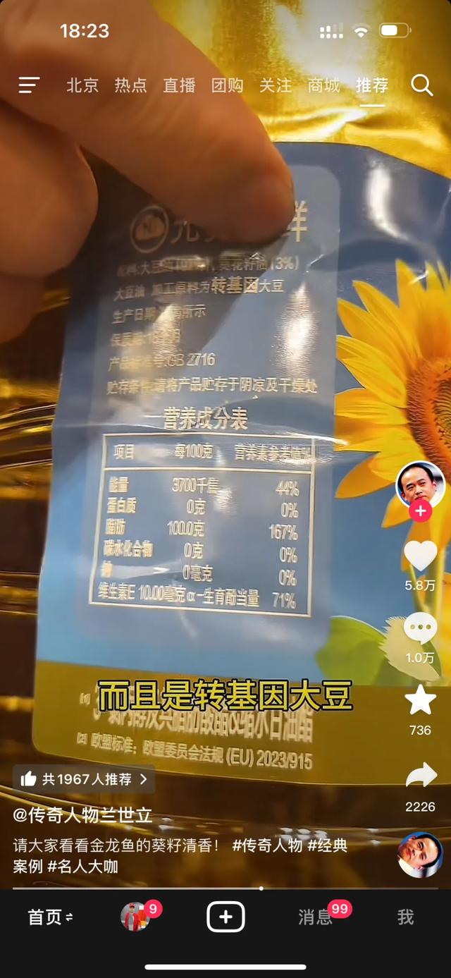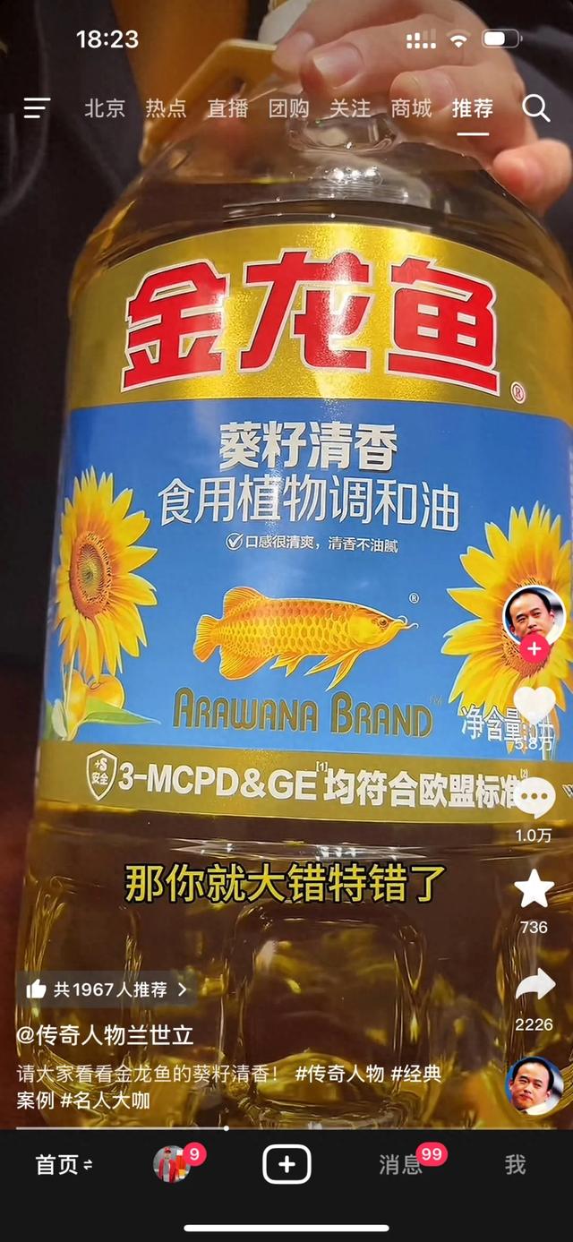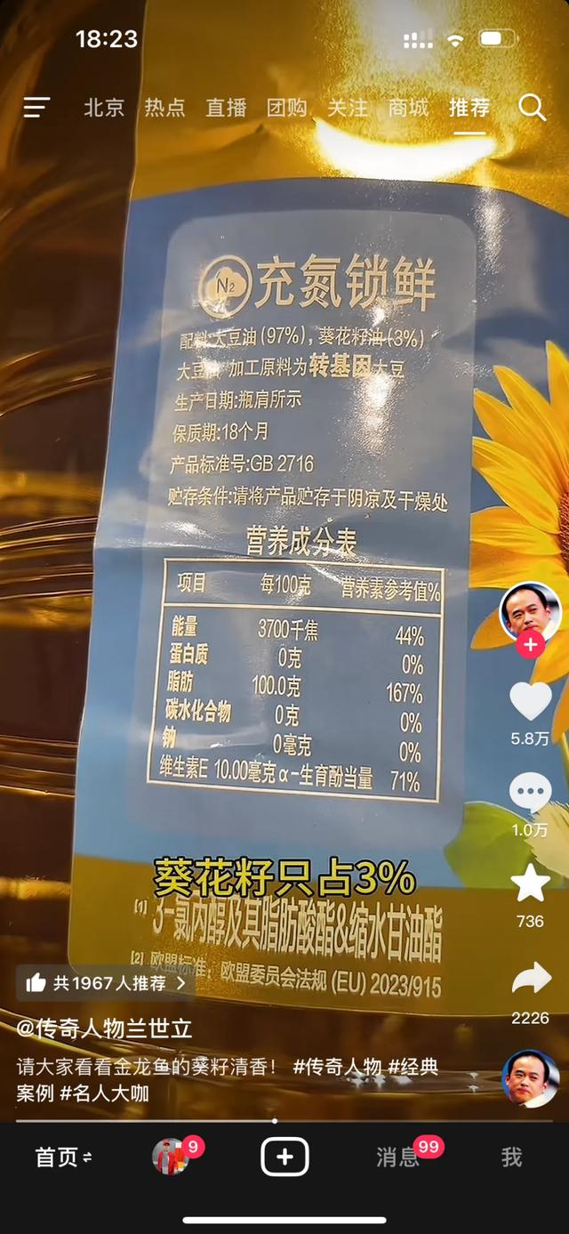 刚才打开抖音,一位自称“传奇人物兰世立”的视频内容被精准推送给了关注食品快消的食悟:兰世立站在办公室里,手握一桶精心挑选的金龙鱼调和油,具体名称是:金龙鱼葵籽清香食用植物调和油,然后给大家仔细认真介绍这款产品。
