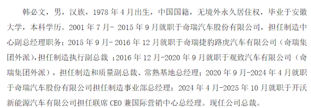 11月28日,众泰汽车公告聘任韩必文为公司总裁。履历显示,韩必文先后就职于奇瑞汽车(09973.HK)、奇瑞捷豹路虎汽车有限公司,有数十年的奇瑞系任职经历。离开奇瑞系后,韩必文2024年4月至2025年10月在开沃新能源汽车有限公司担任联席CEO兼国际营销中心总经理,直至此次履新众泰汽车总裁一职。