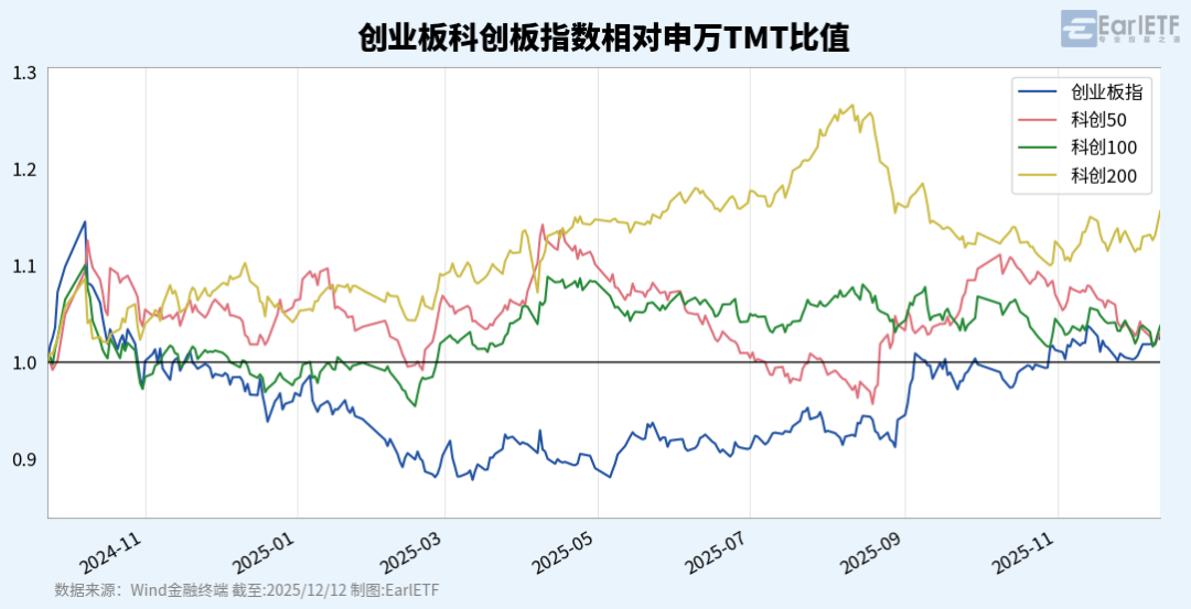 几个主流创业科创宽基指数,究竟哪个相对大TMT板块在走强,比值图是一个很好的观察对象。曲线向上者,代表在TMT内部走强。