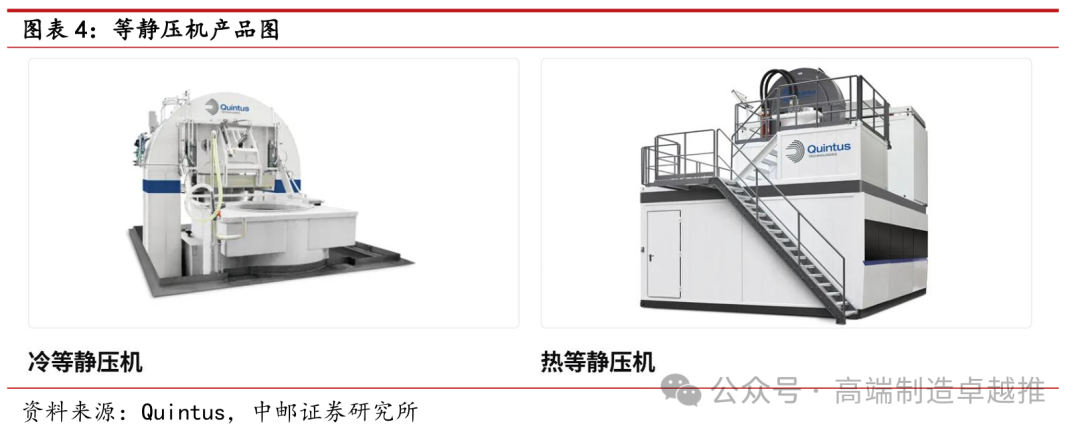 海外厂商主要有瑞典的Quintus Technologies,推出的QIB 300和QIB 600系列温等静压机,专为全固态电池中试生产而设计,设备可提供高达600 MPa的压力和145℃的温度;还有韩国的Hana Technology,和日韩电池厂商合作密切。