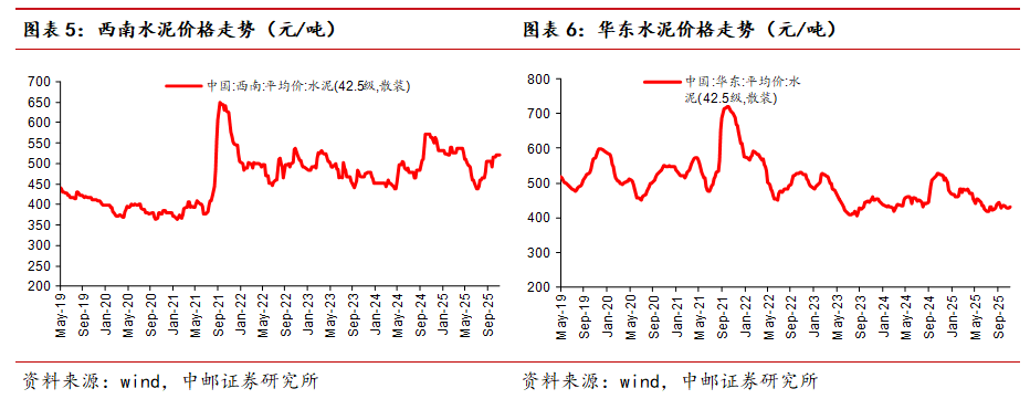 本周全国水泥市场价格环比小幅上行,11月北方逐步进入采暖季,错峰生产政策将推动供给收缩,价格有望迎来阶段性上涨,同时短期由于部分项目抢工,需求阶段性提升。整体来看,基建端整体受到天气干扰、需求释放节奏等因素影响,其对需求并未完全显现,房建端,需求端仍然处于弱复苏态势。25年10月单月水泥产量为1.48亿吨,同比下滑15.8%。