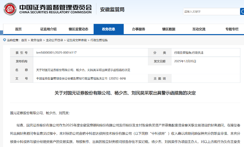 12月5日,安徽证监局发布关于对国元证券、杨少杰、刘民昊采取出具警示函措施的决定,经查,国元证券股份有限公司作为2025年度安徽富煌钢构股份有限公司发行股份及支付现金购买资产并募集配套资金暨关联交易项目的财务顾问,在接受委托出具财务顾问专业意见过程中,未对标的公司合肥中科君达视界技术股份有限公司(以下简称“中科视界”)收入确认跨期问题保持充分的职业审慎、未充分核查中科视界与部分经销类客户的交易实质,导致制作、出具的独立财务顾问报告存在不实记载。杨少杰、刘民昊作为项目主办人,对以上违规行为负有主要责任。