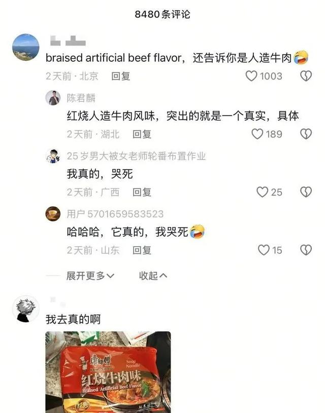 在部分海外市场,康师傅不仅把“面”改成“味”,还在“红烧牛肉味”底下用一行英文明确标注:Braised artificial beef flavor,翻译过来就是红烧人造牛肉风味。