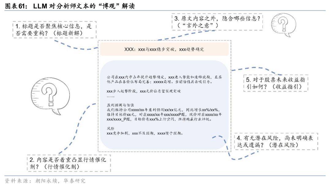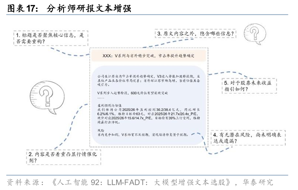 在前期研究《人工智能92:LLM-FADT:大模型增强文本选股》(20250610)中,我们考虑到原始分析师研报虽然通常以精确有效的信息传达为核心目标,然而受限于篇幅、语言组织等方面,对于读者而言,研报中或多或少蕴含着需要额外梳理的信息。我们对研报标题及摘要提出多个问题,例如“标题是否聚焦核心信息,是否需要重构”,“内容是否着重凸显行情催化剂”,“原文内容之外隐含哪些信息”,“有无潜在风险尚无明确表达或遗漏”,“对于股票未来收益指引如何”,要求大模型逐一发表见解,以充分体现大模型对文本的“博观”解读。