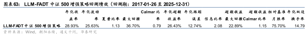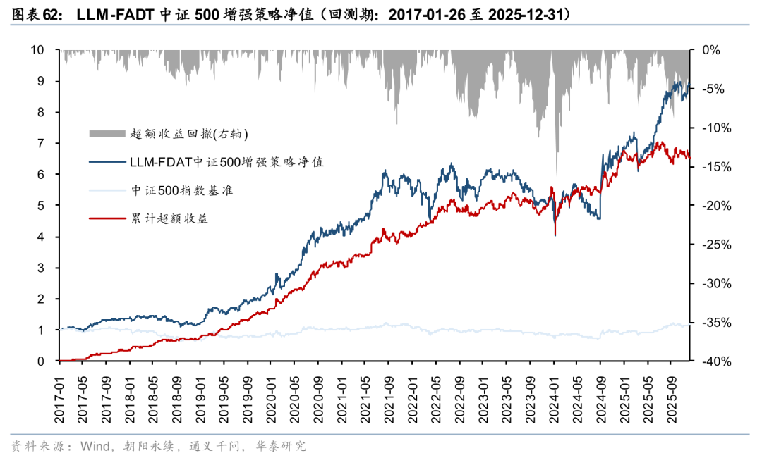 截至2025年12月31日,文本LLM-FADT组合本月以来相对中证500超额收益-2.0%,今年以来超额收益2.3%,本周超额收益回撤。自2017年初回测以来年化收益率28.93%,相对中证500超额年化收益26.43%,组合夏普比率1.13,信息比率2.08。