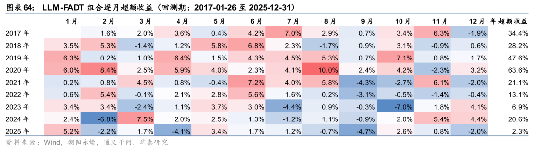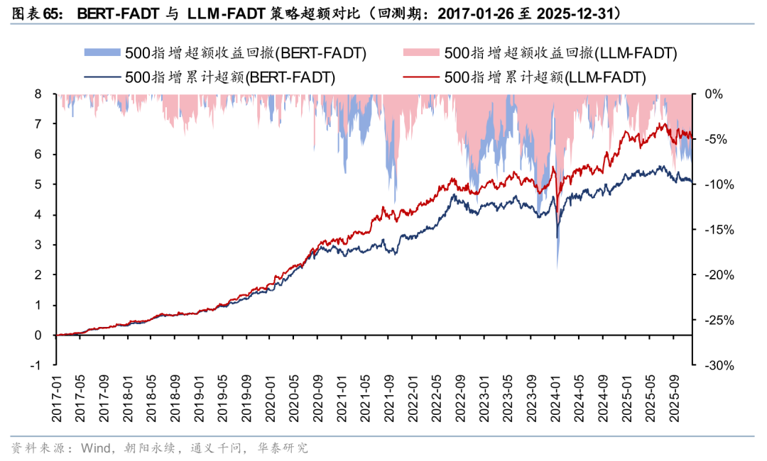 相比于仅依赖原始文本的BERT-FADT,LLM-FADT策略总体更为稳定,超额回撤相对较小。自2024年10月以来,LLM-FADT策略超额总体稳定跑赢BERT-FADT,LLM-FADT策略超额回撤优于BERT-FADT。